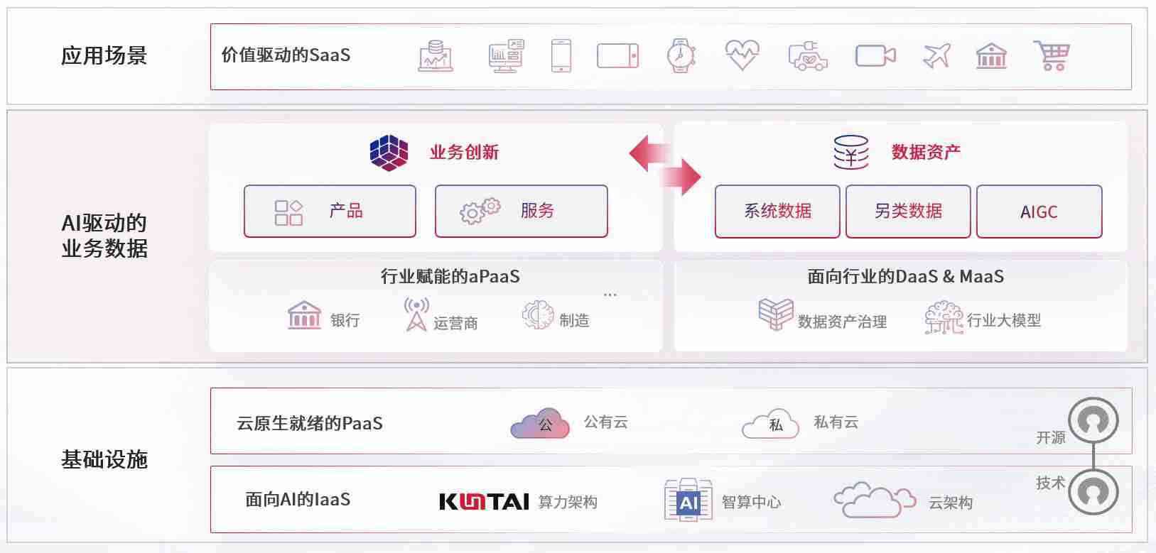 数字时代,,,围绕企业数字化转型的关键要素,,,,狗子28数码开创性的提出数云融合战略和技术体系框架,,,,着力在云原生、、数字原生、、、、AI原生和信创产业上架构产品和服务能力,,为处在不同数字化转型阶段的快消零售、、、汽车、、金融、、、、医疗、、、、政企、、、、教育、、、运营商等行业客户提供泛在的敏捷IT能力和融合的数据驱动能力,,,,构建跨界融合创新的数字业务场景和新业务模式,,,助力企业级客户建立面向未来的核心能力和竞争优势,,全面推动社会的数字化、、智能化转型升级。。。